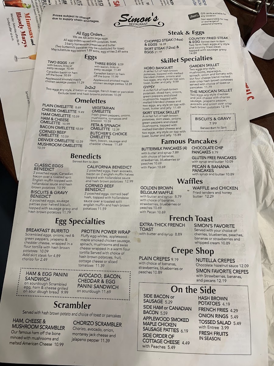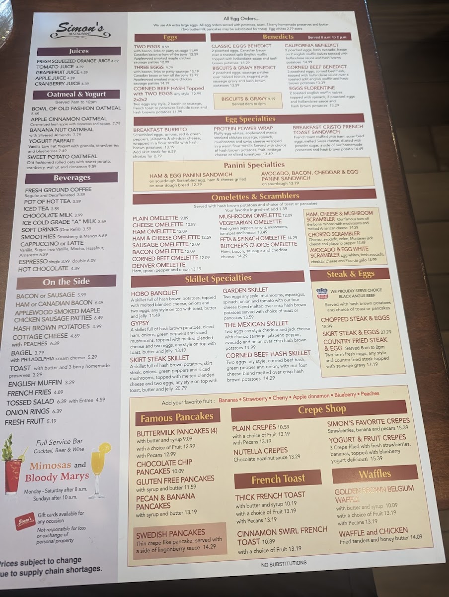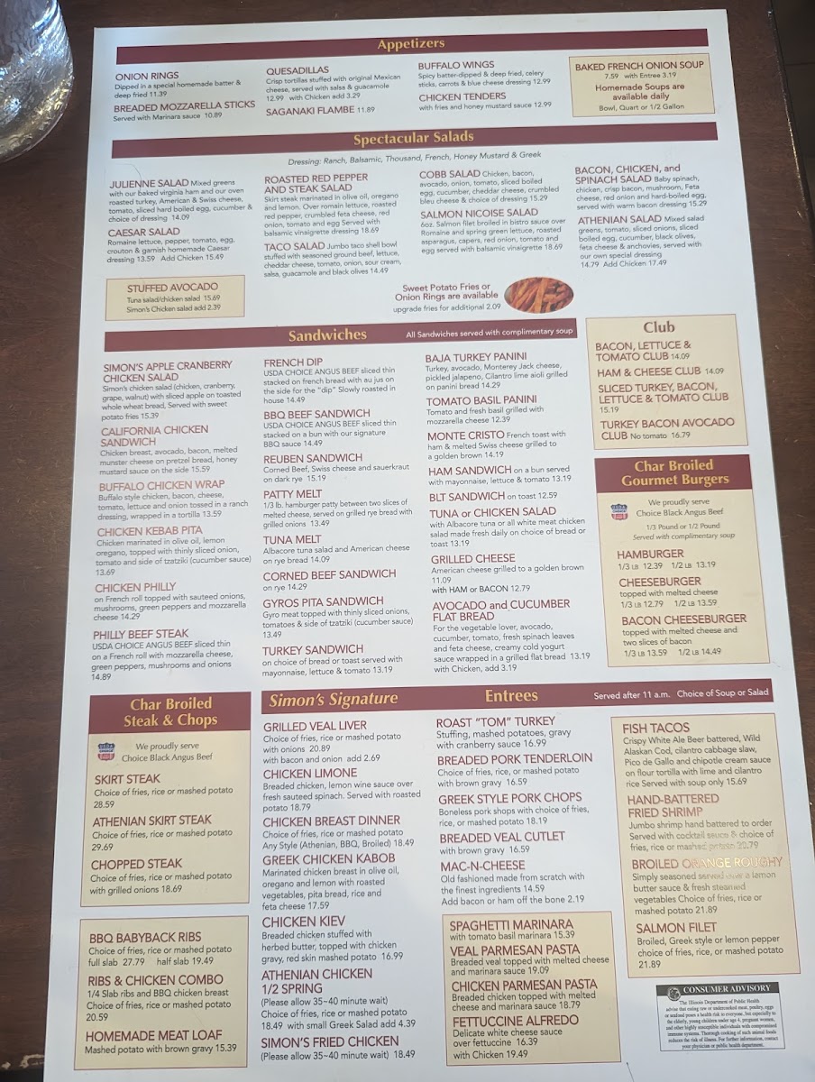 At Simon's Restaurant Menu, you'll find a delightful mix of comforting classics and bold, innovative dishes, all served with a side of genuine hospitality. Located at 2 Roosevelt Rd, Villa Park, IL, this spot is perfect for anyone craving a satisfying meal, whether you're in the mood for something light or a heartier option. From fresh salads and hearty soups to mouthwatering burgers and signature entrees, every dish is crafted with the finest ingredients. For those with a sweet tooth, don't miss out on the indulgent desserts, made to end your meal on a perfect note. The menu features a variety of options to please every palate, ensuring that every visit is a memorable one. Whether you're stopping by for a casual lunch or a cozy dinner, Simon's offers something for everyone.
